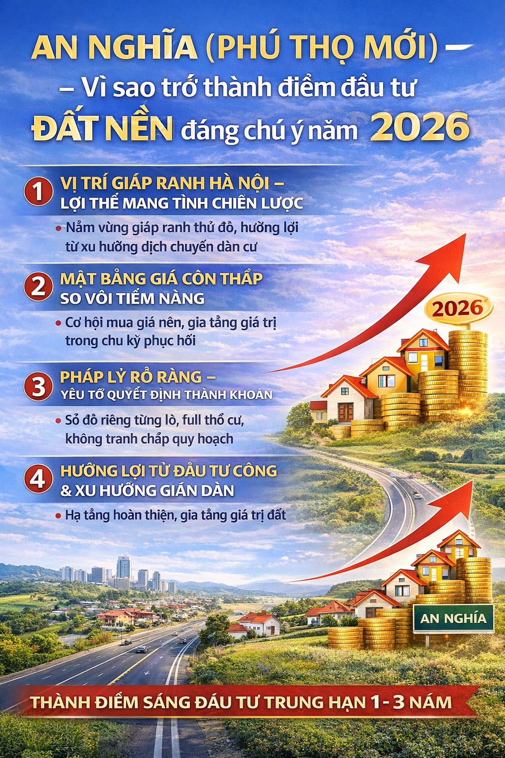 Bước sang 2026, thị trường bất động sản ven đô không còn là cuộc chơi của “sóng tin đồn”, mà là sân chơi của giá trị thực – pháp lý rõ – dòng tiền thật. Trong bức tranh đó, khu vực An Nghĩa (Phú Thọ mới) đang nổi lên như một điểm đến đáng cân nhắc cho cả nhà đầu tư lẫn người mua ở thực.